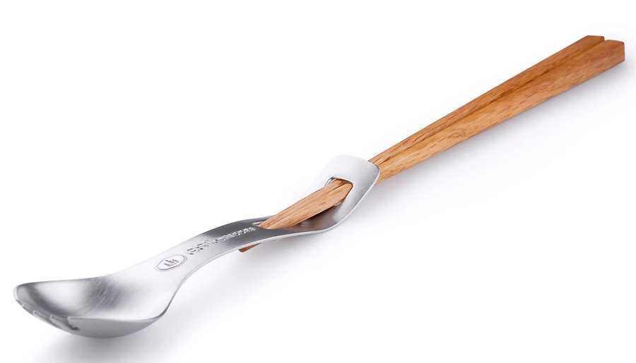 Das Besteck ist zweiteilig, beide Teile können separat genutzt werden: ein Paar Eßstäbche aus Holz, ein Kurzstiel-Spork aus Edelstahl. Letzterer hat eine Einschuböffnung im Stiel, in die die Eßstäbchen eingeführt werden können.