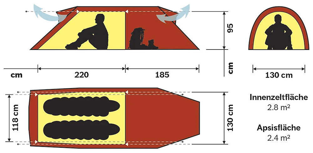 - Tipps zur Wahl der Grösse: im Sommer kann die Zeltgrösse entsprechend „Nutzer-Anzahl gleich Namenszusatz“ gewählt werden. Für Wintereinsätze empfehlen wir eine Nummer grösser, also „2 Nutzer wählen die 3er-Version“.