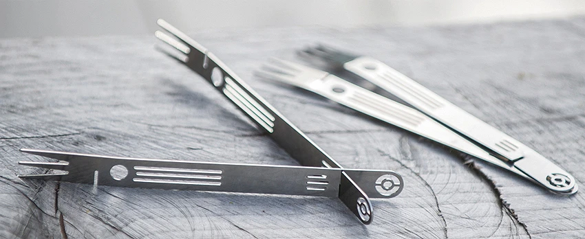 Dies ist eine Grillzange, oder es sind zwei Gabeln mit packfreundlichem Maß… Eine Schweizer Idee, und auch noch in der Schweiz hergestellt. Eine sehr nützliche und vielseitige Idee!